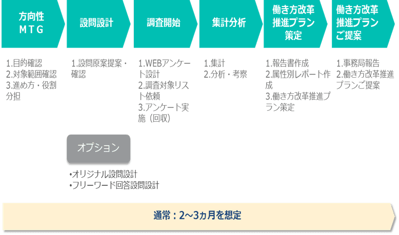 推進担当者ヒアリング、現場従業員へのアンケート調査実施、アンケート結果の分析、テレワーク導入に伴う課題・推進プランを提示した報告書作成・報告 |